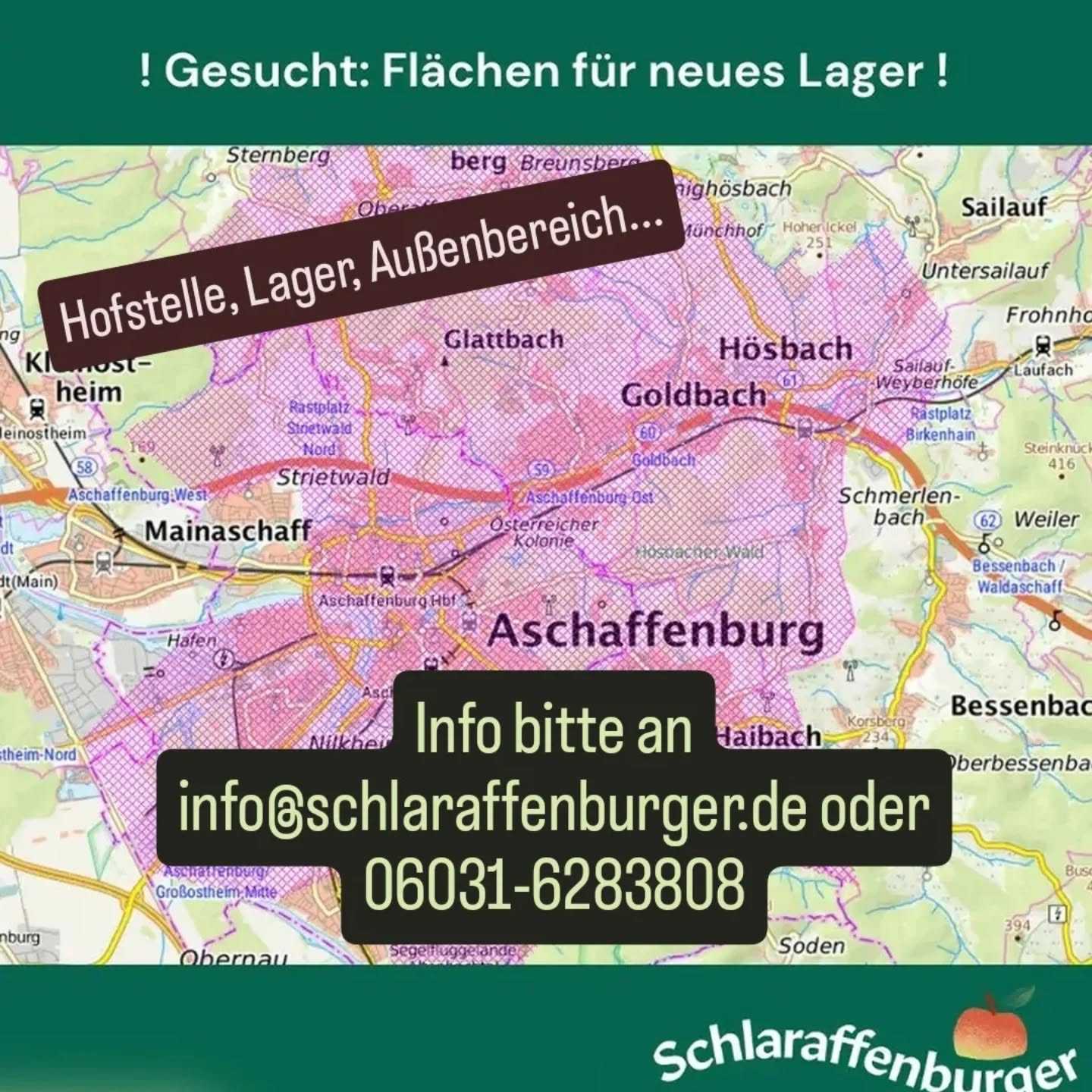 Die Schlaraffenburger gGmbH sucht für ihren Streuobstbetrieb im Raum AB eine landwirtschaftliche Hofstelle oder Lagerhalle zum Kauf oder zur Pacht. info@schlaraffenburger.de; 06021-6283808.