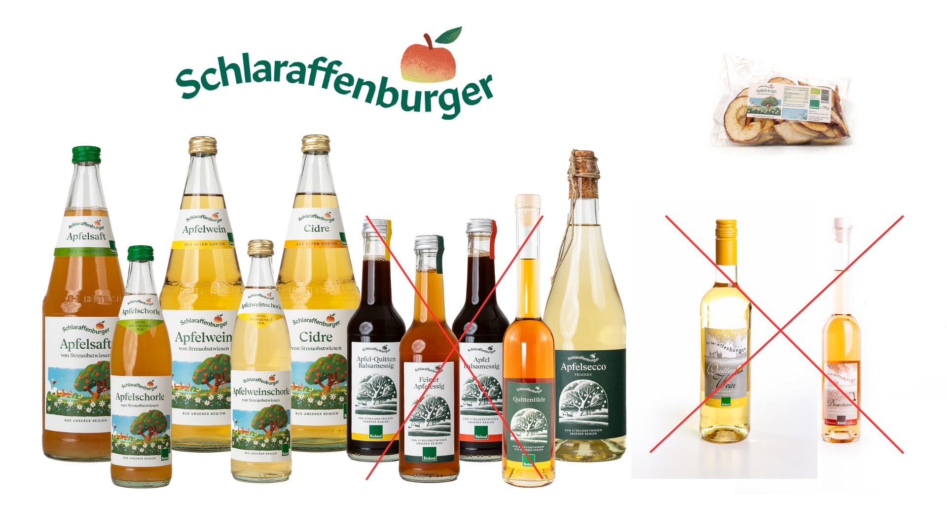 Apfelsaft, Apfelschorle, Apfelwein, Apfelweinschorle und Cidre sowie der Schlaraffenburger Apfelsecco sind davon nicht betroffen und nach wie vor erhältlich.